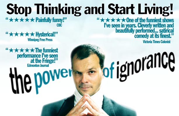 In 2002, fringe festival favourite, TJ Dawe saw an excerpt of a short film called ‘The Power of Ignorance’. He thought it could be developed into a good one-man show, obtained the permission of the original film-makers, Jeff Sumerel and Sam Reynolds, and approached Chris to co-write and perform it. The show’s premiere was the 2003 Canadian Fringe tour, selling out every performance in Winnipeg and Edmonton. Since then the show has toured throughout Canada, expanding to a 90-minute version, the script of which, along with the book, was published by Brindle and Glass.